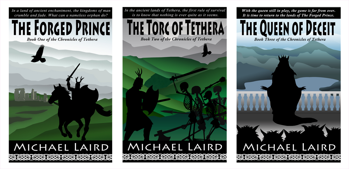 Here are the first three covers for The Chronicles of Tethera. I keep dithering over them. I was going for a sort of 1960’s retro look. I also like the silhouettes because I like to think it gives the readers carte blanche to fill in the character’s actual appearances. Plus, I knew what I wanted and a fair price for all of these as paintings would be . . . moderately imprudent. Can’t do it with purchased pictures either, as the armor has to be quite specific as it is 6th to 8th century, extremely high end (and perhaps a tad of an atavism), heavy chain with some small plate pieces, with a full bucket helm mounted with small antlers, and a large viking-like round shield with Dipylon style cutouts.